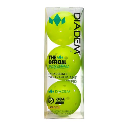 El paquete de 3 pelotas Diadem Power Pickleball para exteriores es la pelota oficial de Power Pickleball, la competici贸n de mayor crecimiento en ligas, clubes y torneos. Con una construcci贸n sin costuras de un solo molde, esta pelota de torneo, aprobada por la USAPA, est谩 disponible en un brillante color amarillo ne贸n para facilitar su seguimiento durante el juego. Su pl谩stico duradero, materiales duros y 40 agujeros de igual tama帽o la hacen ideal para canchas al aire libre. Tanto si eres un bateador potente como un jugador de bajo rendimiento, el paquete de 3 pelotas Diadem Power Pickleball para exteriores ofrece una excelente durabilidad para apoyar tu juego.
