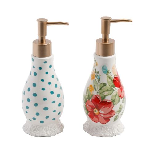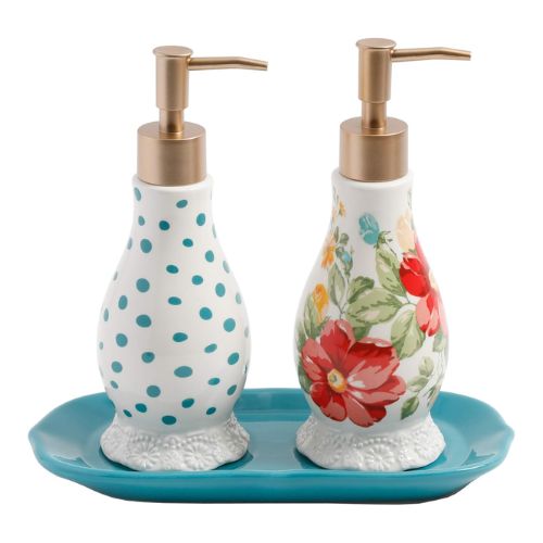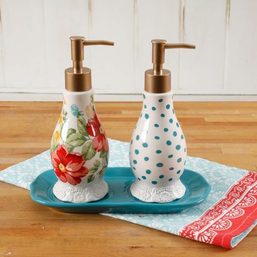 Este juego de jabón y loción floral vintage está hecho de gres. Para limpiar el juego de jabón y loción, lavar a mano solamente. Bandeja de bomba de jabón con bomba de loción, diseño floral encantador hecho de gres lavado a mano solamente.