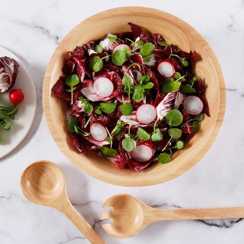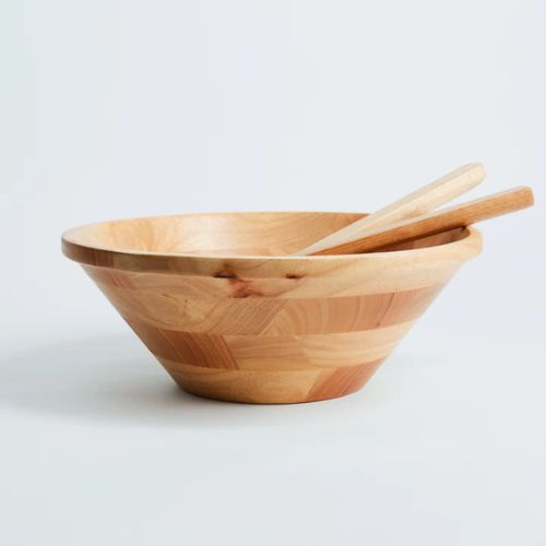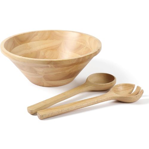 Hermosa ensaladera de madera de 13 pulgadas con servidores hecha de madera de caucho con variaciones en capas del grano natural y acabado liso. Recipiente grande para servir verduras mezcladas y ensaladas de pasta. los utensilios duraderos para servir cuentan con un agarre seguro y ergonómico al lanzar, recoger y servir.