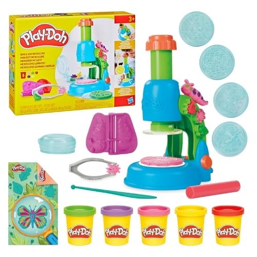 Juguemos a ser científicos: Explora y crea con este juguete Play-Doh que cuenta con un microscopio de juguete que realmente se ilumina (requiere 3 baterías AAA, no incluidas) Llena un portaobjetos y colócalo debajo del microscopio de juguete para ver efectos de brillo geniales. Tapete de juego con temática de naturaleza: El tapete fomenta el juego imaginativo y facilita la limpieza. Los niños pueden moldear insectos, plantas y gérmenes tontos de mentira y atraparlos en la placa de Petri o aplastarlos debajo del microscopio. Es divertido crear y explorar con los 4 portaobjetos de microscopio, pinzas, cuchillo y otros accesorios Play-Doh. Las latas de 2 onzas de masa para modelar incluyen rojo, amarillo, azul, violeta y rosa (contiene trigo).