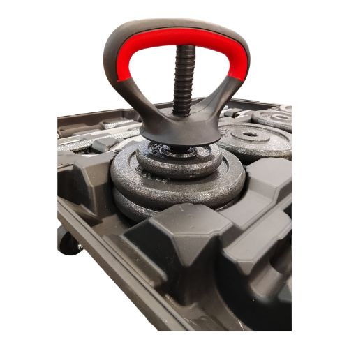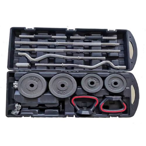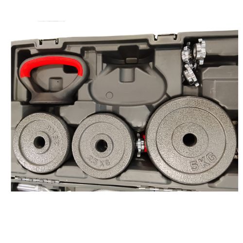 Peso total: 58 kg incluyendo placas, barras y collares. Acabado cromado duradero: resistente al óxido y de larga duración. Componentes incluidos: Barras para mancuernas, varillas de conexión para barra, barra EZ curl, barra recta, collares de bloqueo giratorio y estuche de almacenamiento resistente. Discos ajustables: discos de 0,5 kg, 1,2 Beneficios de usar este juego de mancuernas Entrenamiento versátil: Convierte mancuernas en una barra para hacer sentadillas, press de banca, remos y más. Diseño que ahorra espacio: todas las pesas en un juego compacto con estuche de transporte Crecimiento y fuerza muscular: mejora la estabilidad del core, los glúteos, los isquiotibiales y la fuerza de la parte superior del cuerpo. Elegante y duradero: el acabado cromado se adapta a la estética del gimnasio moderno.5 kg, 2,5 kg y 5 kg para entrenamientos flexibles
