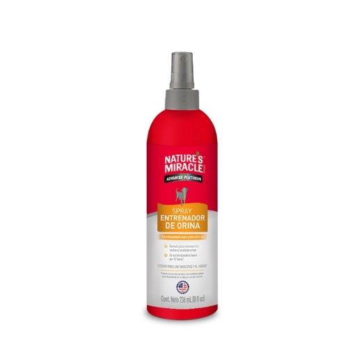 El Spray Entrenador de Orina Nature’s Miracle está especialmente formulado para ayudarte a enseñarle a los cachorros a orinar en el lugar adecuado. El aroma atrayente actúa como una señal para que los cachorros reconozcan que está bien hacer las necesidades en el lugar que usted roció. La fórmula entrenadora fue diseñada para uso interior y exterior del hogar y tiene un efecto duradero de hasta 12 horas. Ayudando a reducir el tiempo de entrenamiento*.