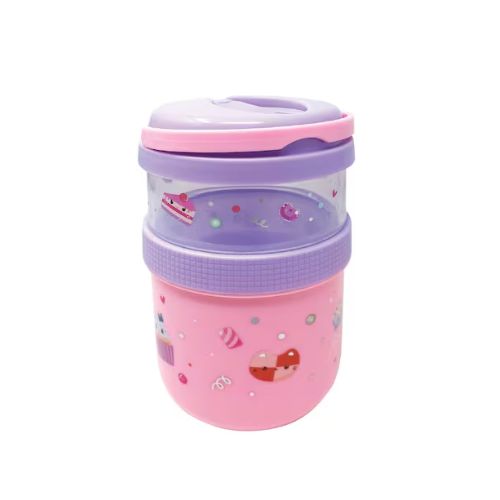 Transporta tus alimentos en este práctico y divertido recipiente con división y cubierto 2 en 1 que de un lado es tenedor y del otro cuchara, la división separa y a la vez une un recipiente con capacidad de 200ml con el otro recipiente con capacidad de 400 ml formando un solo recipiente apilable. Incluye también una bolsa de gel que se congela para una vez congelado mantener los recipientes frios por más tiempo.