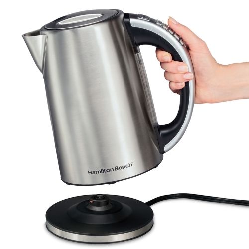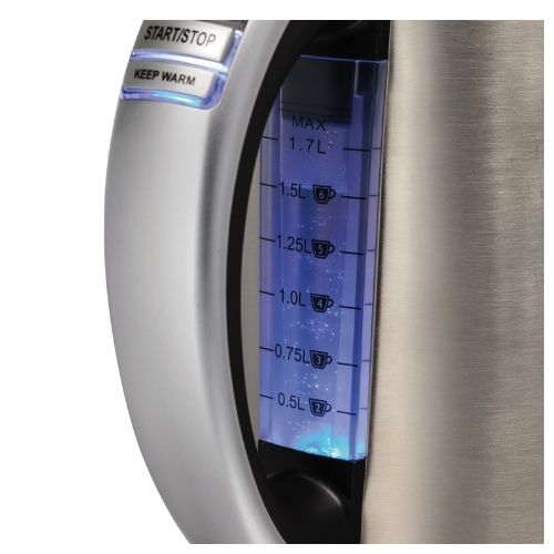 Más rápido que un microondas y más seguro que un hervidor de estufa 6 configuraciones de temperatura El agua se mantiene a la temperatura seleccionada durante 30 minutos. Opción para mantener caliente Ventana grande de agua con luces LED Apagado automático con protección contra ebullición Servicio sin cable 1.7 litros de capacidad Filtro de malla extraíble Exterior de acero inoxidable cepillado