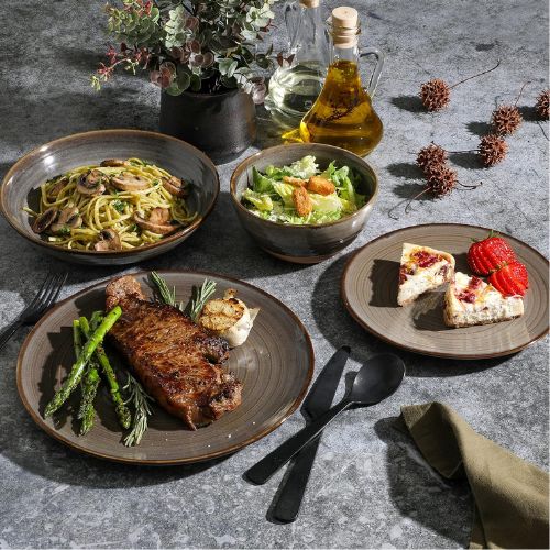Servicio para 4 que incluye 4 de cada uno de los siguientes: platos para la cena de 10,75”, platos para el almuerzo o postre de 8,5”, tazones para la cena de 9” y tazones para cereales de 6”. Resistente a roturas, apto para microondas
