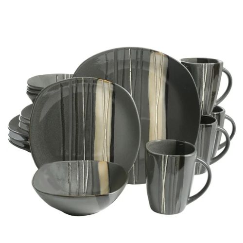 4 platos llanos de 11,25 pulgadas. 4 platos de postre de 9,25 pulgadas. 4 cuencos de 7,25 pulgadas. 4 tazas de 16 oz. Apto para lavavajillas. Apto para microondas. Hecho de gres.
